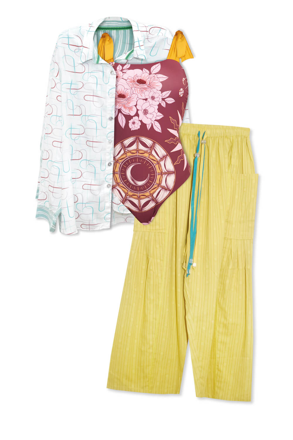 Pack: Pantalón Silencio Mostaza + Traje de Baño Andromeda Vino + Camisa Grus Crudo