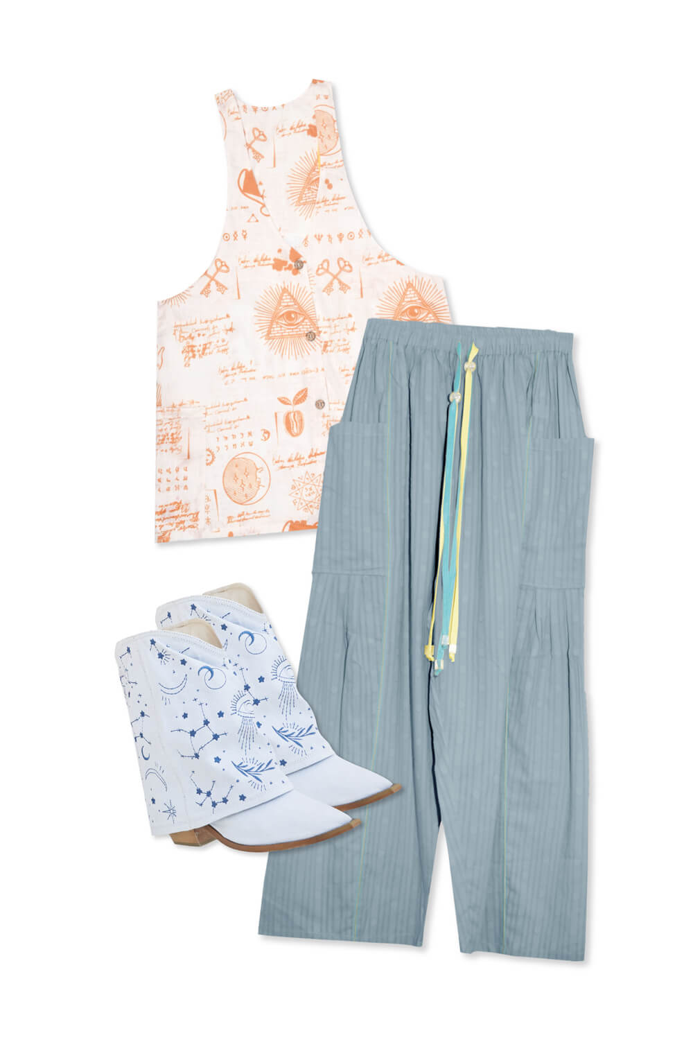 Pack: Pantalón Silencio Verde Oliva + Chaleco Lyra Naranja + Botas Constelación Mezclilla