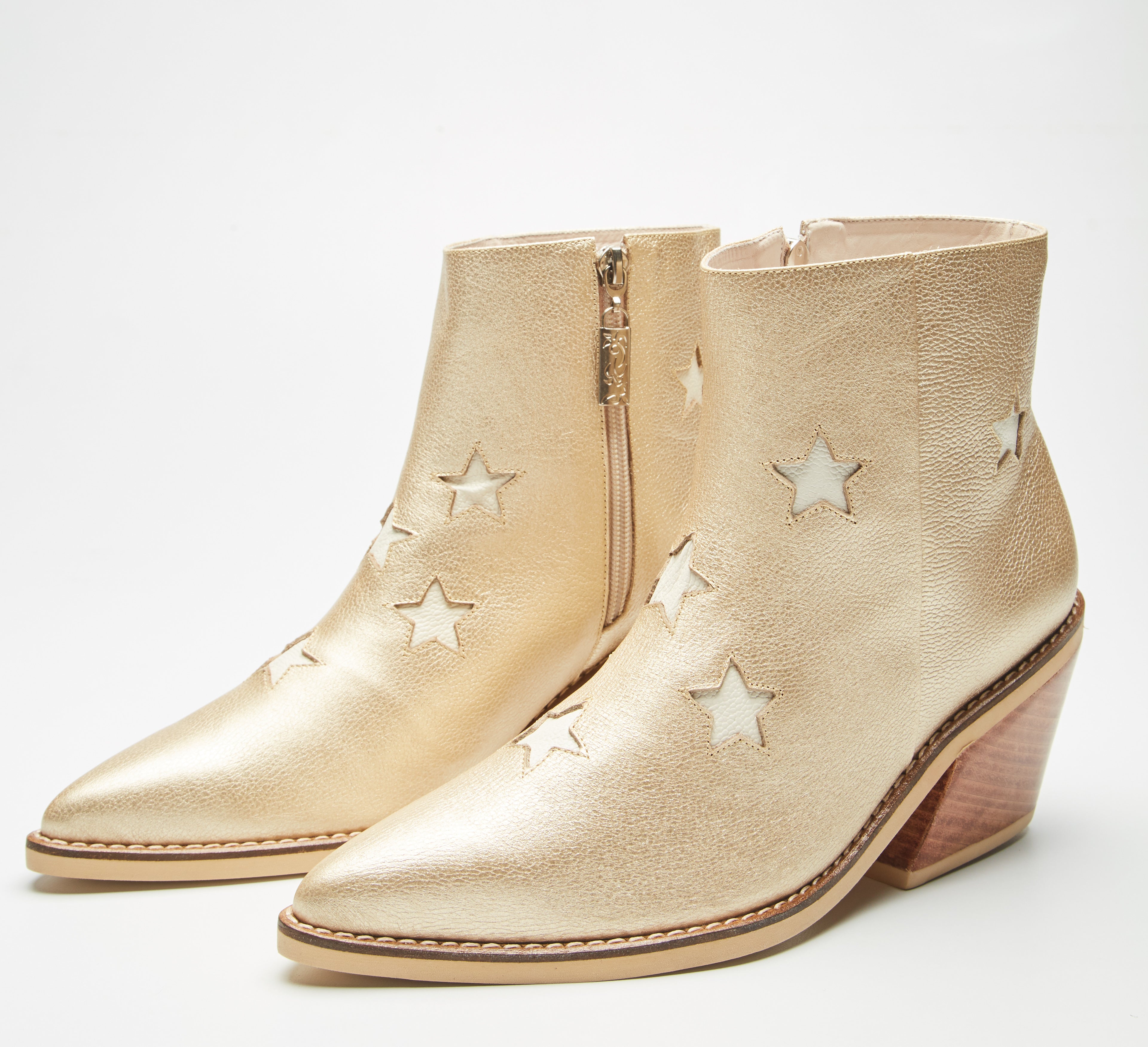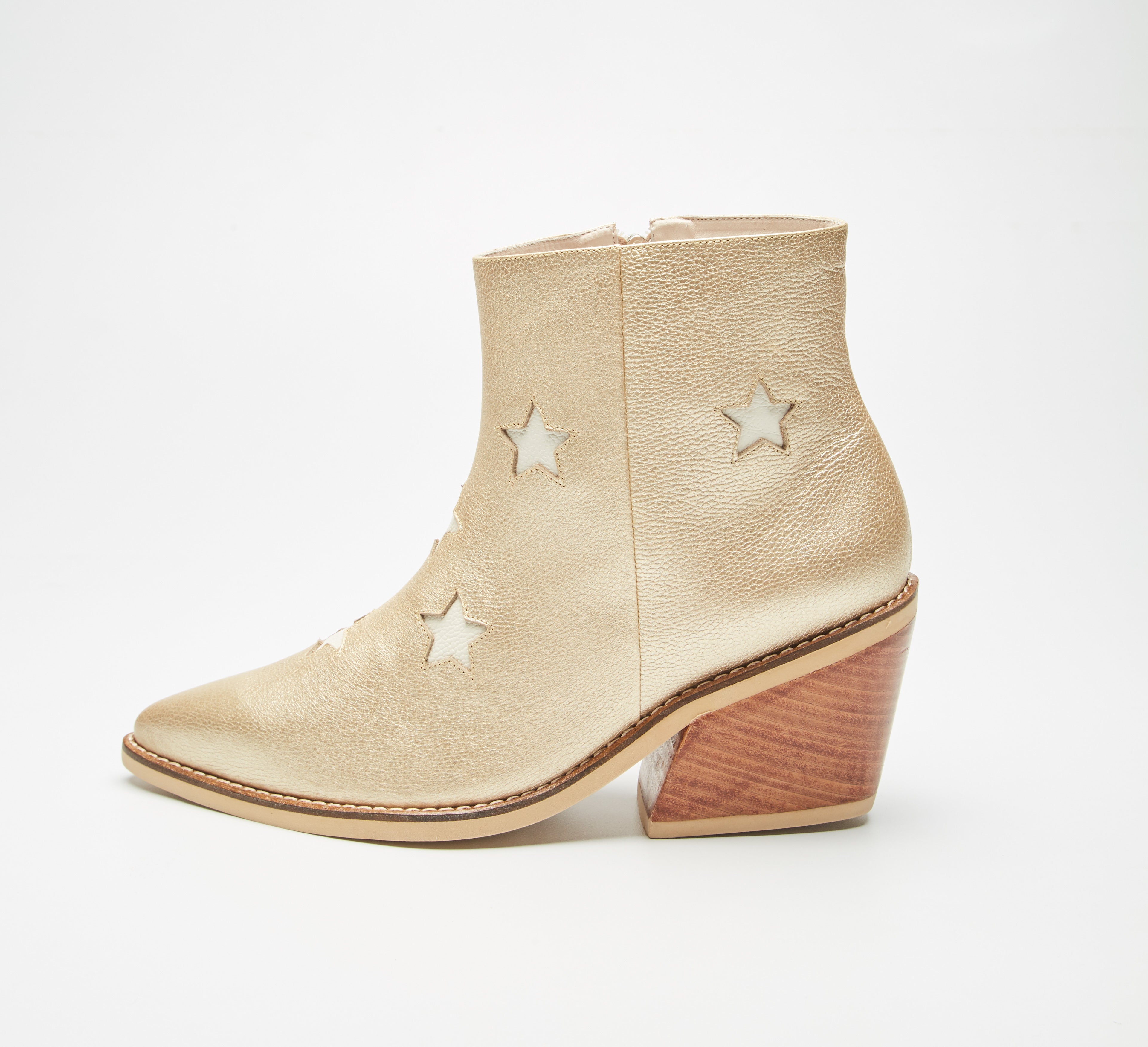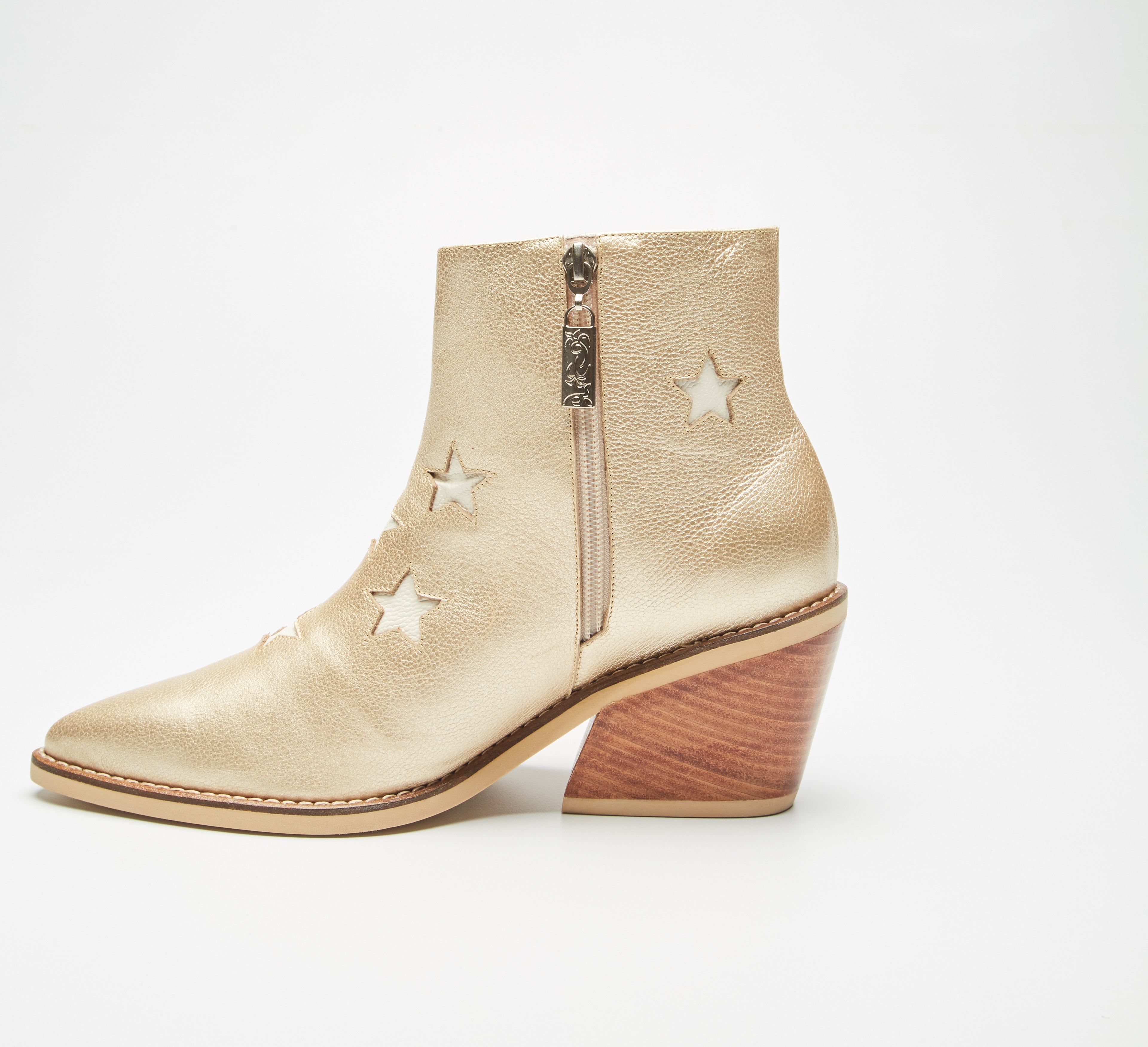 Ilumina tu camino con nuestras Botas Estrella Oro, un tributo deslumbrante a la elegancia y el brillo. Hechas con pasión en Colombia y diseñadas para la mujer mexicana contemporánea, estas botas de caña baja son una declaración audaz de estilo y confianza.