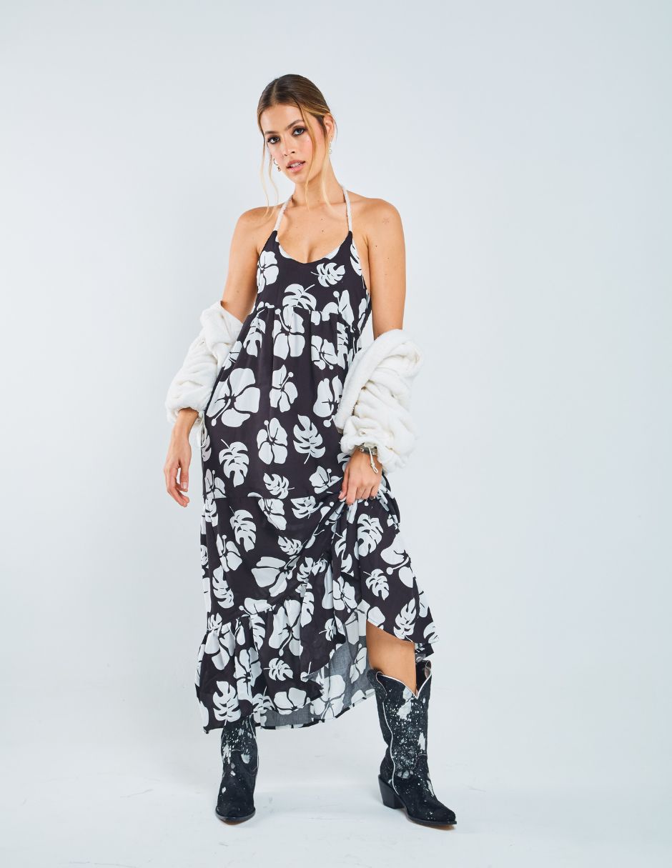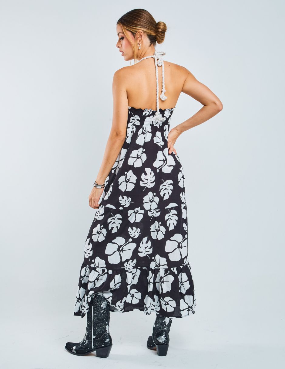 Vestido largo,  amarre en cuello con cuerda de algodón, estampado floral.  Todas nuestras prendas son hechas a mano y exclusivas, fabricamos pocas cantidades de nuestros productos, y son elaboradas con altos estándares de calidad.