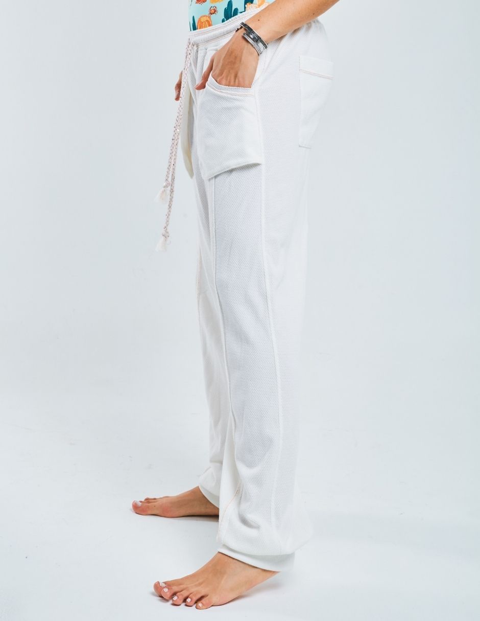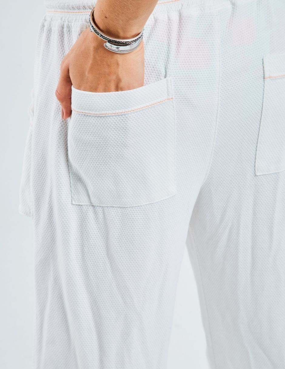 King Penguin pants. Ecru-colored casual pants are an informal garment made in a light and neutral tone. The ecru color resembles an off-white or pale beige tone, giving it a relaxed and versatile look. This type of pants is ideal for informal occasions, offering comfort and style without being too formal. Its soft and neutral tone allows it to be easily combined with a wide variety of garments and colors, adapting to different styles and preferences. Color: Ecru |