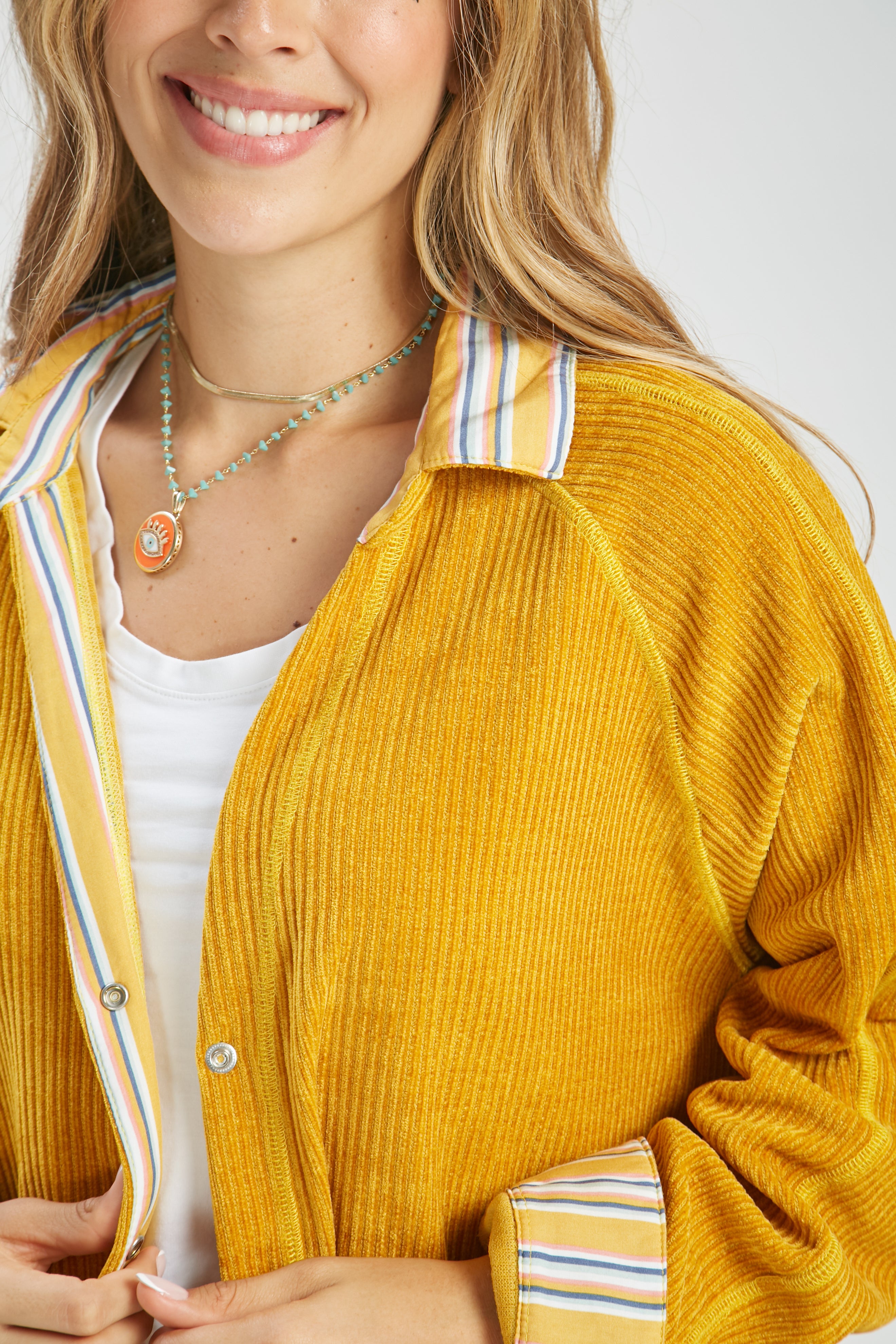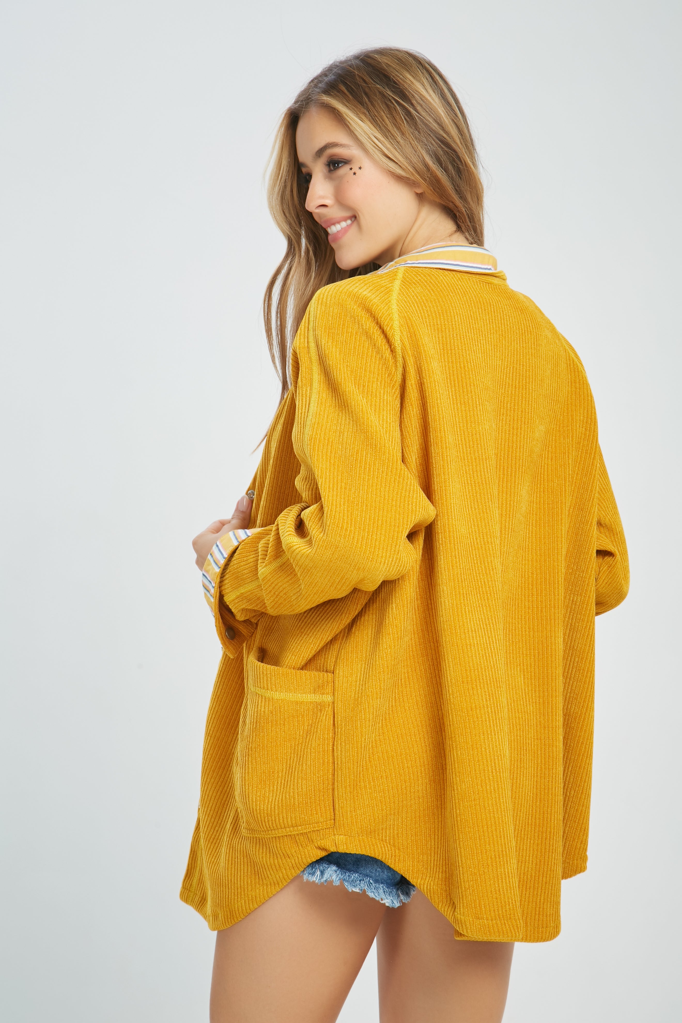 El diseño incluye botones frontales que añaden un toque de elegancia, mientras que los detalles de las mangas en colores contrastantes aportan un aire divertido y único. Perfecta para combinar con tus jeans favoritos o sobre un vestido ligero, esta chamarra se convertirá en un esencial en tu armario.