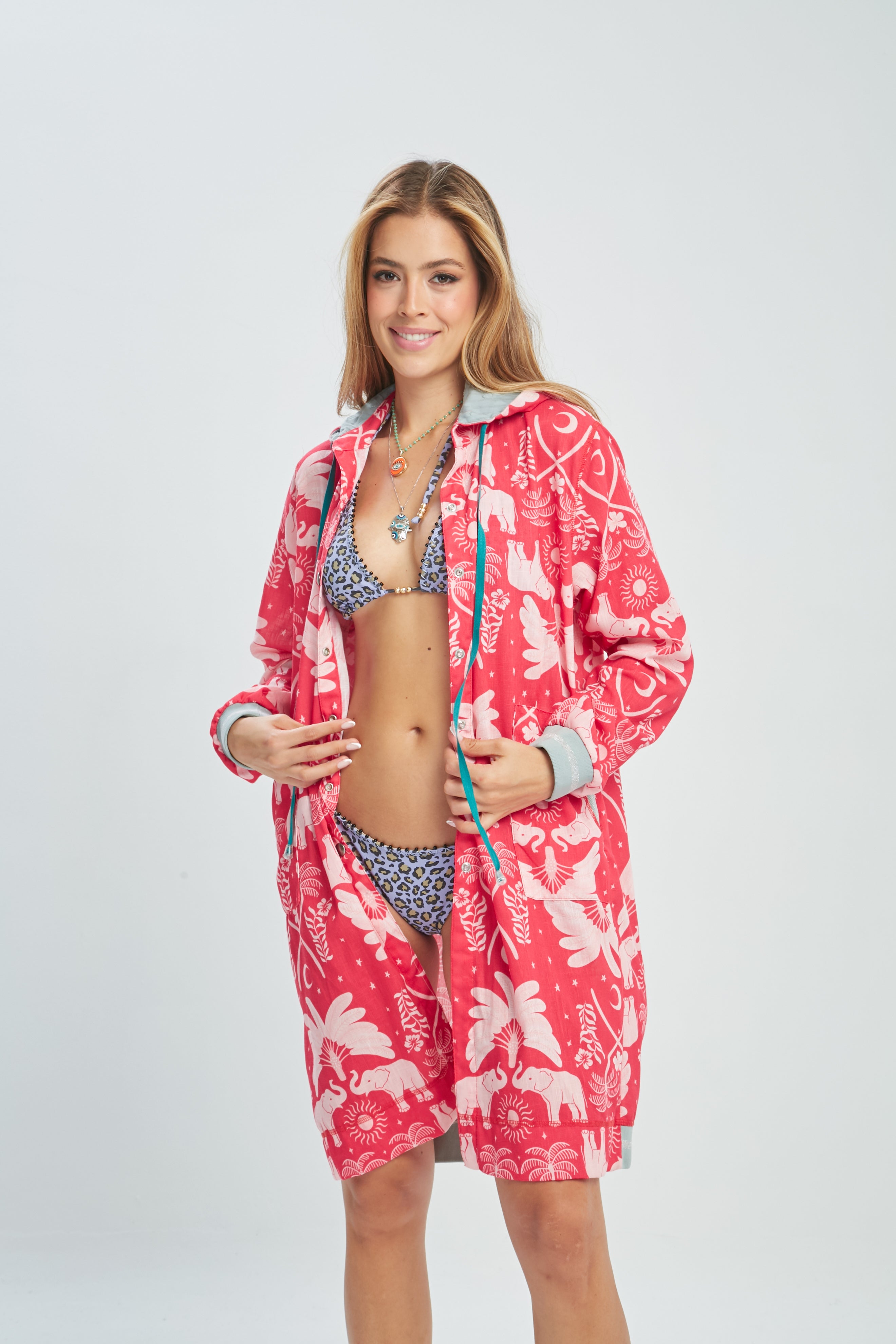 Confeccionado en 100% poliéster, ofrece una sensación ligera y fresca, perfecta para esos días soleados en la playa o junto a la piscina. Su estampado divertido y colorido resalta tu personalidad y complementa cualquier bikini.