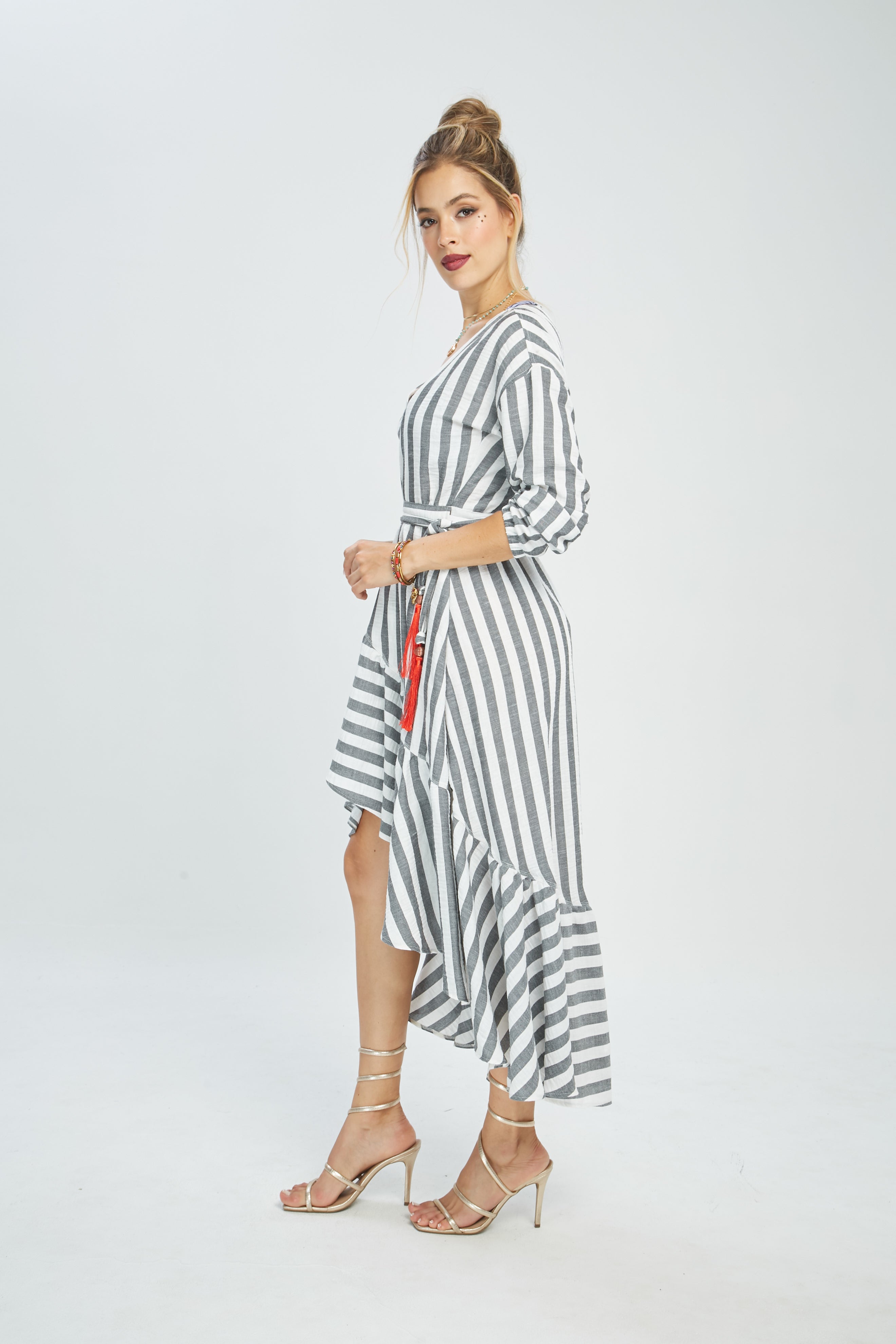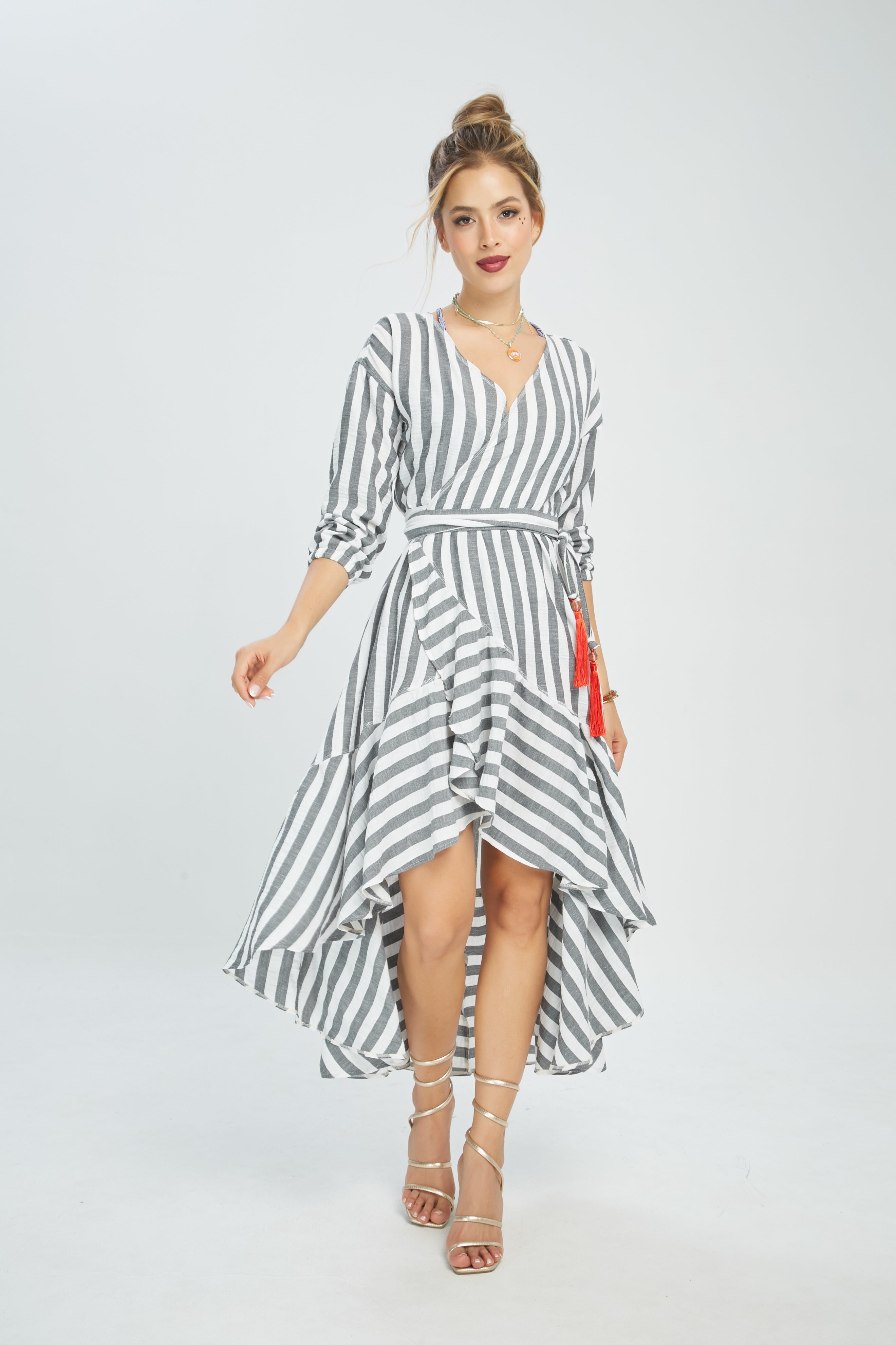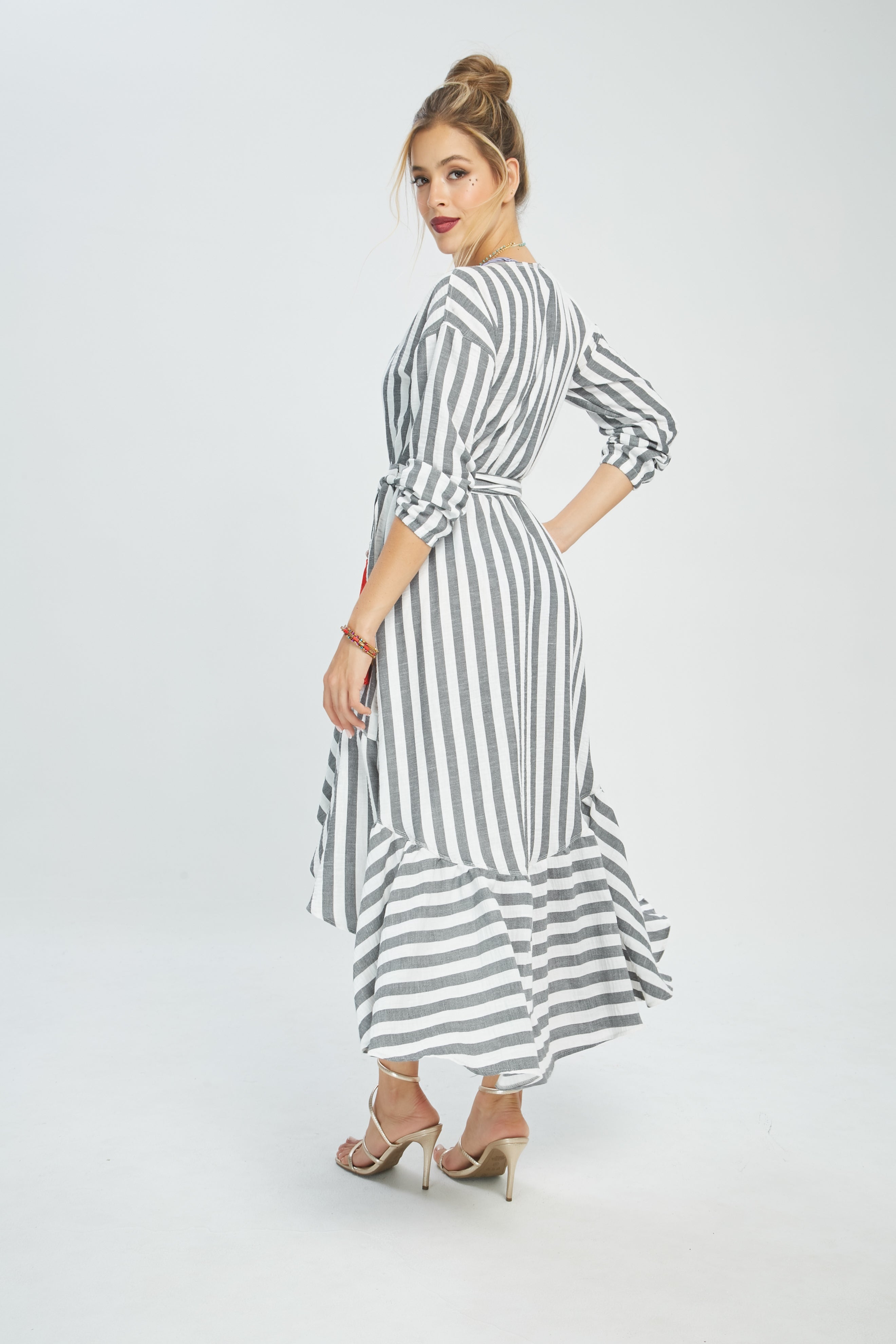 Diseñado con un fit regular, su corte envolvente realza la figura mientras ofrece comodidad en cada movimiento. Las mangas largas y el diseño de rayas añaden un toque moderno, haciendo de este vestido una opción versátil tanto para un día casual como para una salida especial.