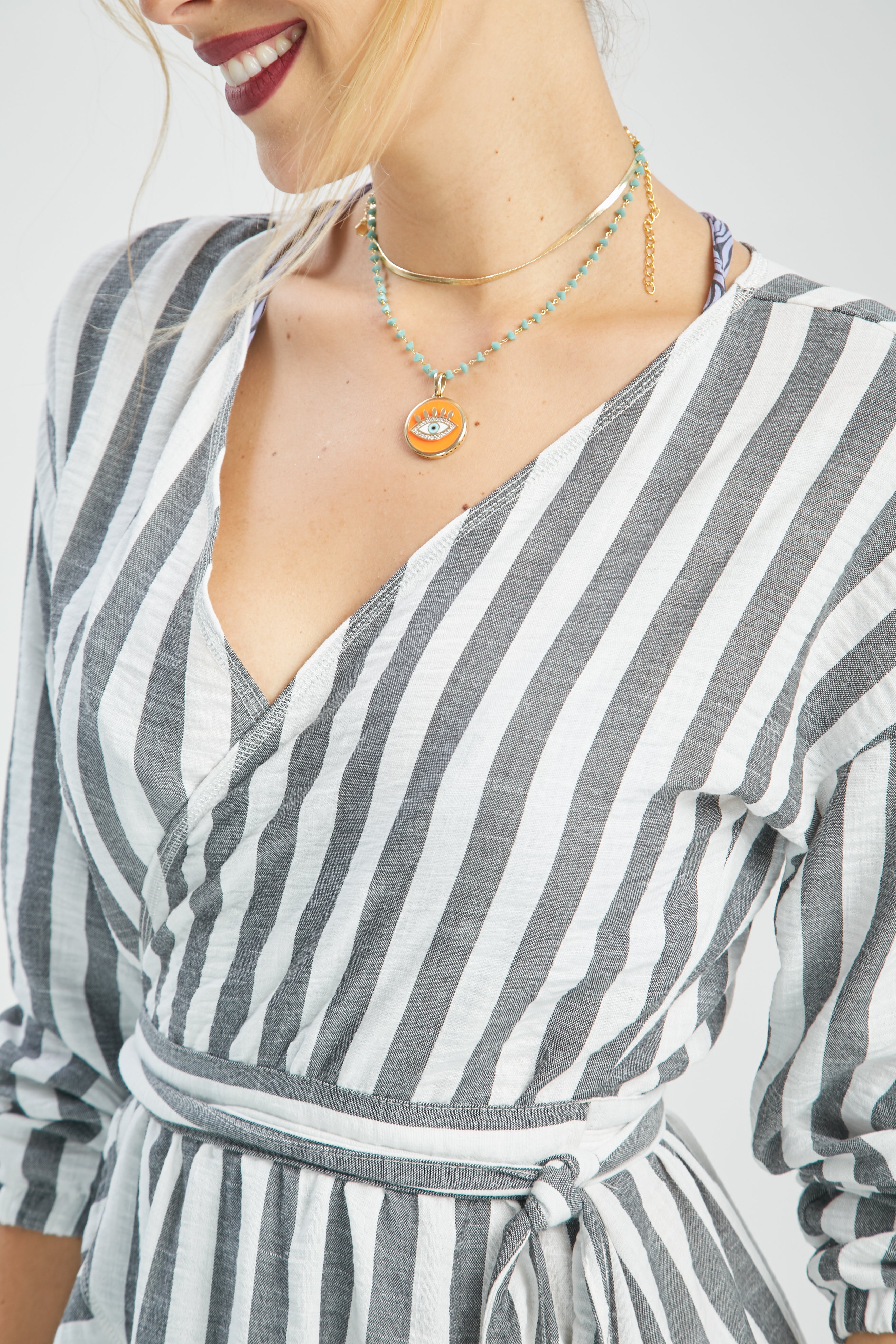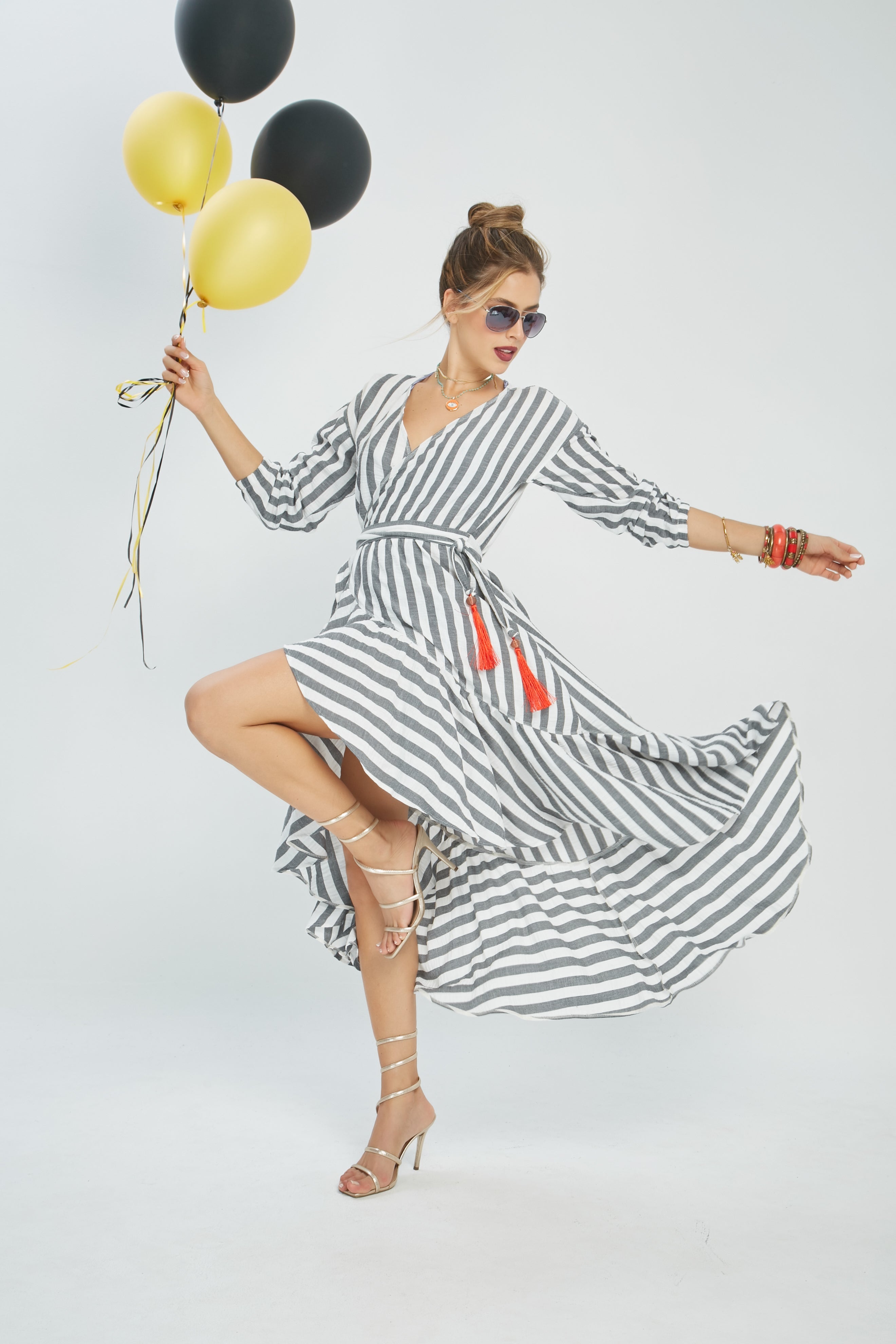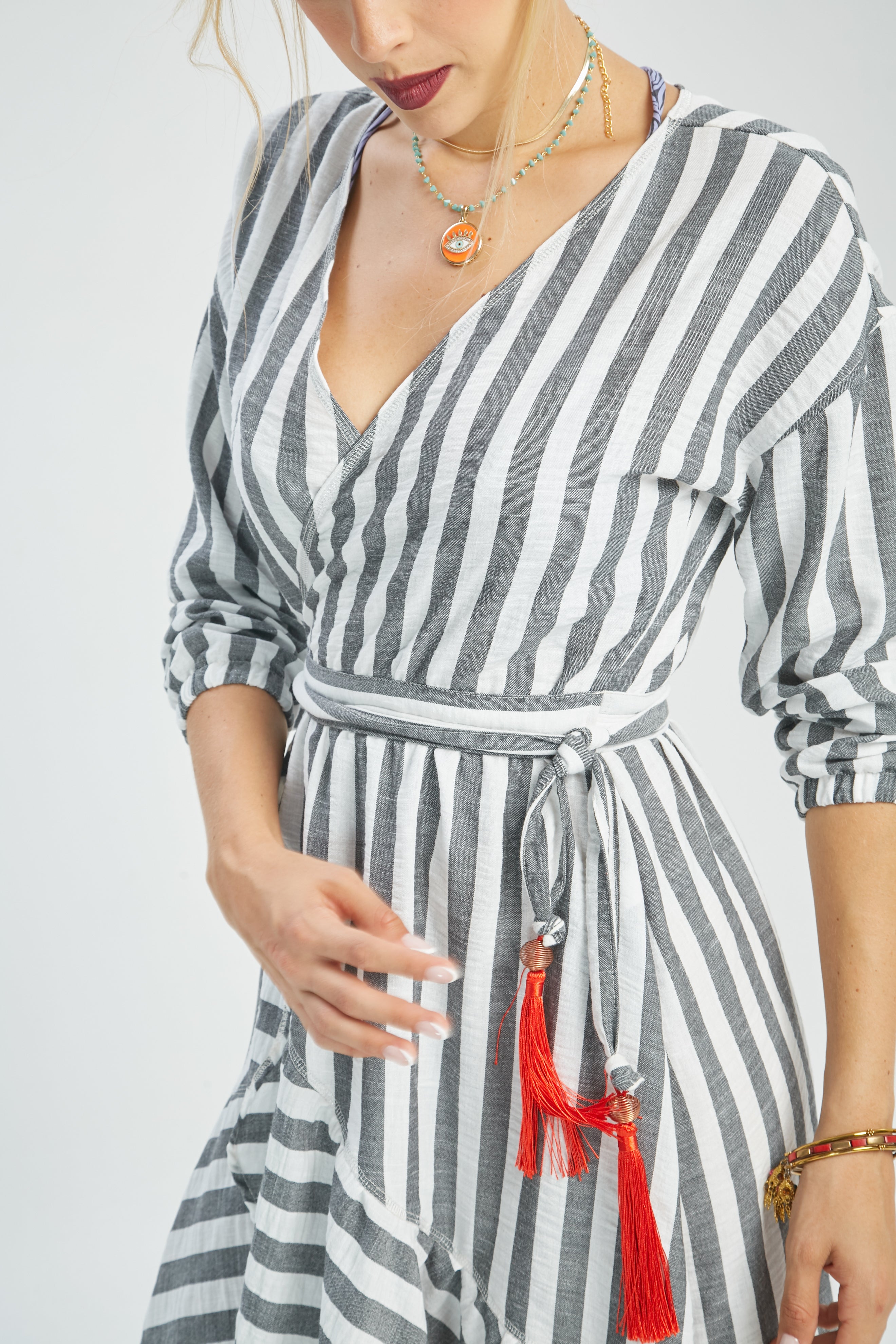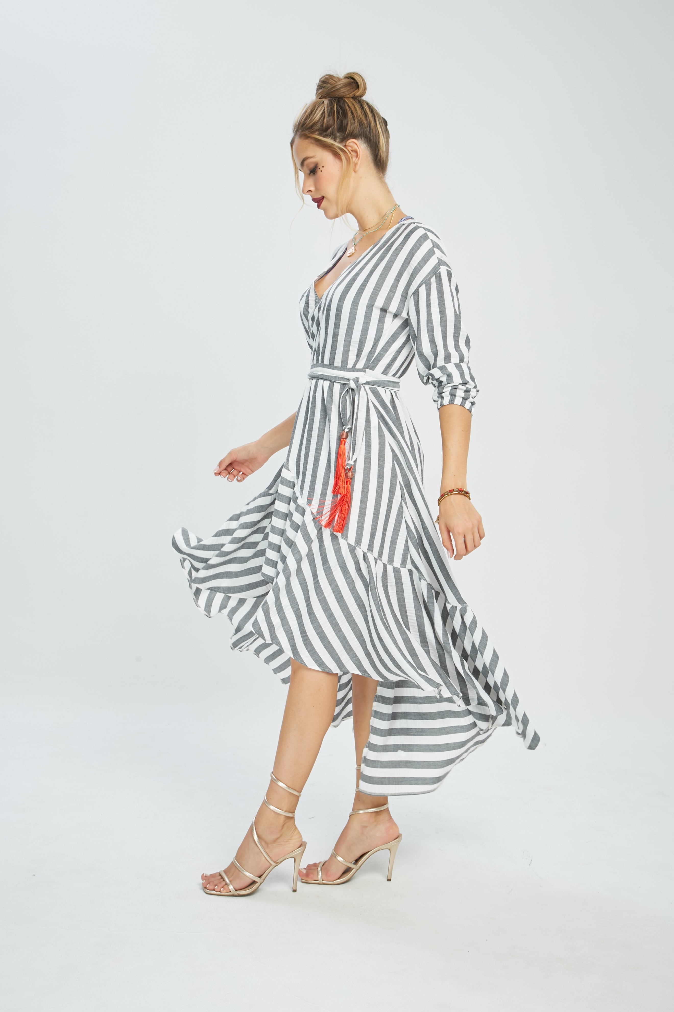 Diseñado con un fit regular, su corte envolvente realza la figura mientras ofrece comodidad en cada movimiento. Las mangas largas y el diseño de rayas añaden un toque moderno, haciendo de este vestido una opción versátil tanto para un día casual como para una salida especial.